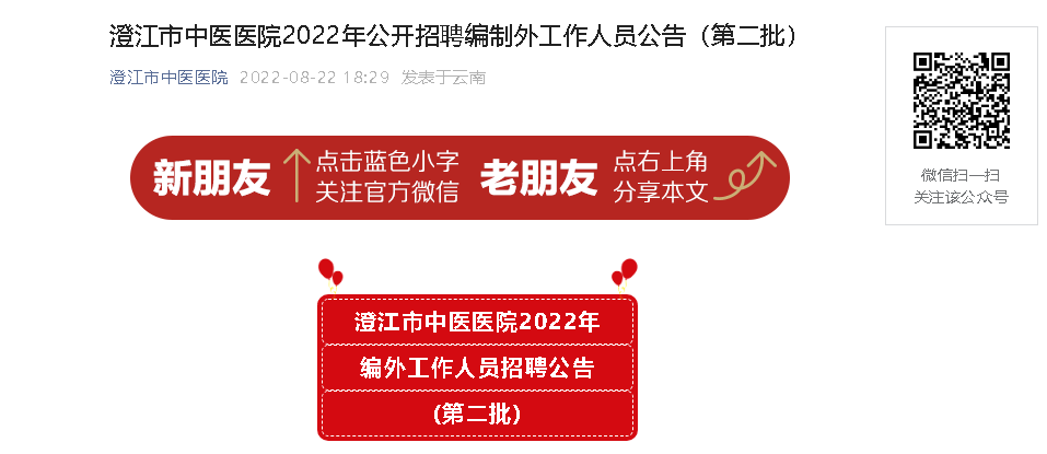 2022云南玉溪市澄江市中醫(yī)醫(yī)院編外人員招聘3人,報名時間:2022年8月25日(上午08:00-11:30,下午14:30-18:00)截止,現(xiàn)將招聘公告原文發(fā)布如下: