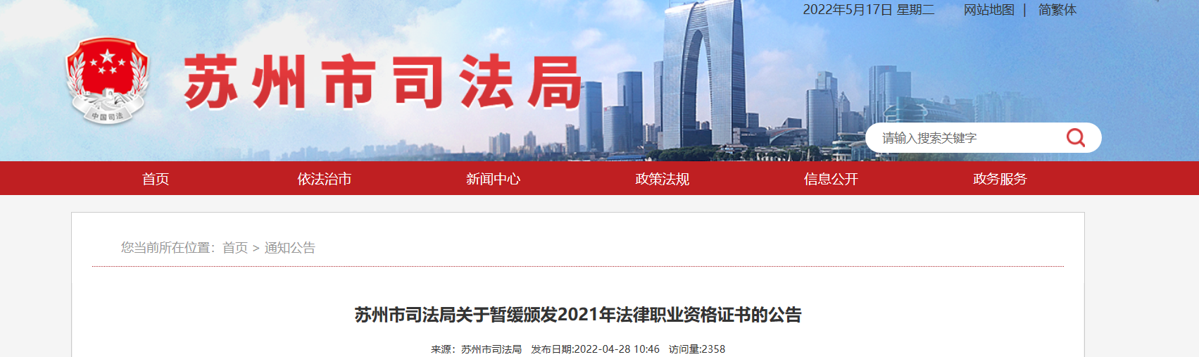 根據(jù)司法部、省司法廳部署和省、市有關(guān)新冠肺炎疫情防控工作要求,為保障廣大申領(lǐng)人員生命安全和身體健康,蘇州市司法局決定暫緩頒發(fā)2021年法律職業(yè)資格證書。具體頒發(fā)時(shí)間、頒發(fā)方式待疫情防控政策允許后將另行公告,請(qǐng)申領(lǐng)人員及時(shí)關(guān)注蘇州市司法局網(wǎng)站和“蘇州司法行政”微信公眾號(hào)獲取相關(guān)信息。