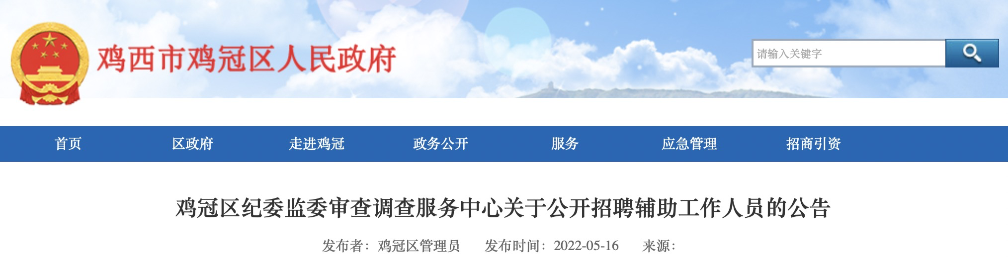 2022年黑龍江雞西市雞冠區(qū)紀(jì)委監(jiān)委審查調(diào)查服務(wù)中心輔助工作人員招聘公告【15人】已發(fā)布,報(bào)名時(shí)間為:2022年5月19日至2022年5月21日,現(xiàn)將招聘公告原文發(fā)布如下: