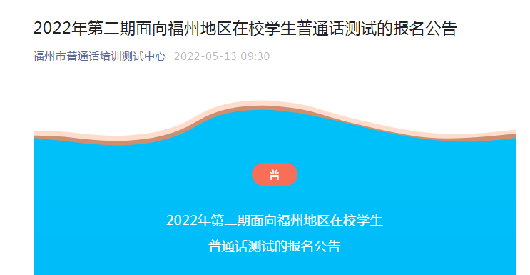 從福州市普通話培訓(xùn)測試中心獲悉,2022年第二期面向福建福州地區(qū)在校學(xué)生普通話測試的報名公告已公布,具體詳情如下: