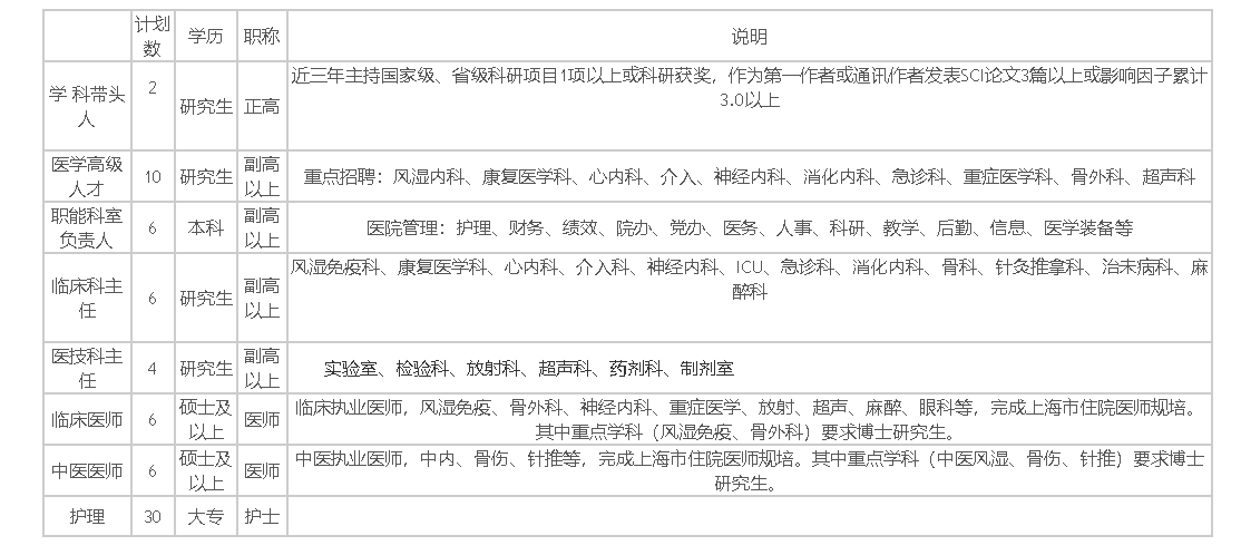 1、研究生學(xué)歷,風(fēng)濕免疫、骨外科、神經(jīng)內(nèi)科、重癥醫(yī)學(xué)科、放射、超聲、康復(fù)、麻醉、眼科專業(yè),其中重點學(xué)科(風(fēng)濕免疫、骨外科)要求博士研究生;