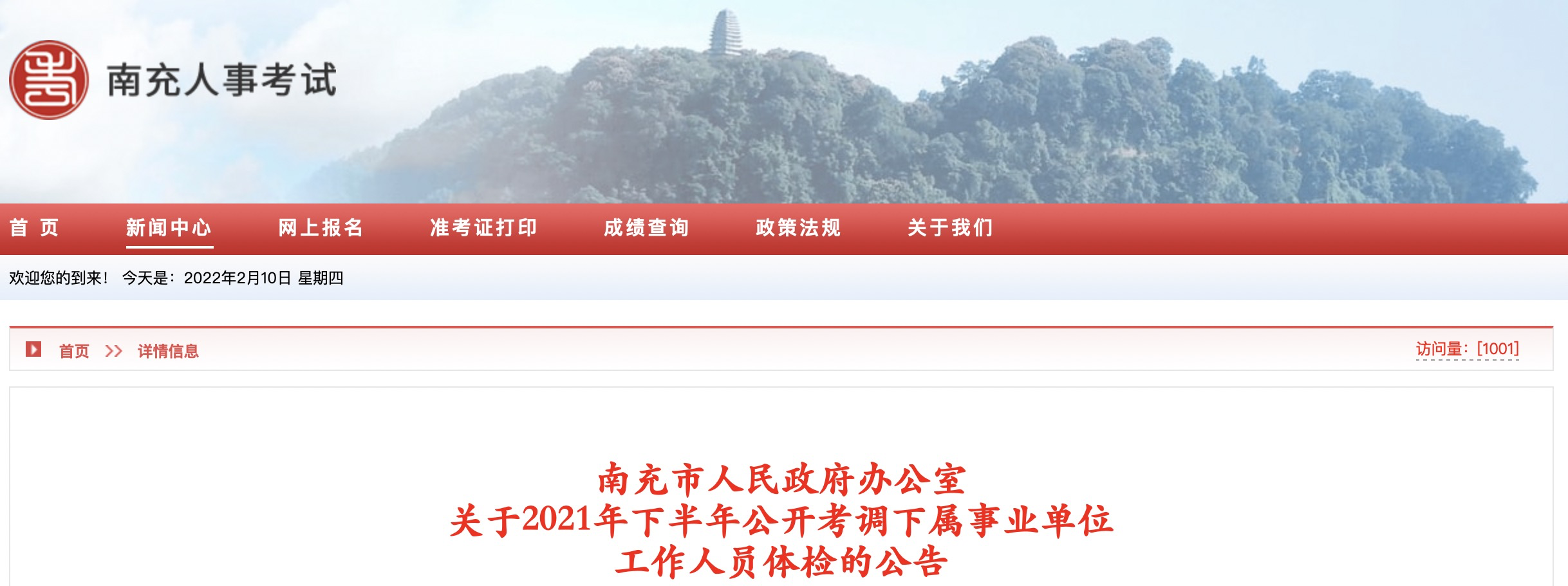 根據(jù)《南充市人民政府辦公室2021年下半年公開(kāi)考調(diào)下屬事業(yè)單位工作人員的公告》規(guī)定,現(xiàn)就公開(kāi)考調(diào)下屬事業(yè)單位工作人員體檢有關(guān)事項(xiàng)公告如下: