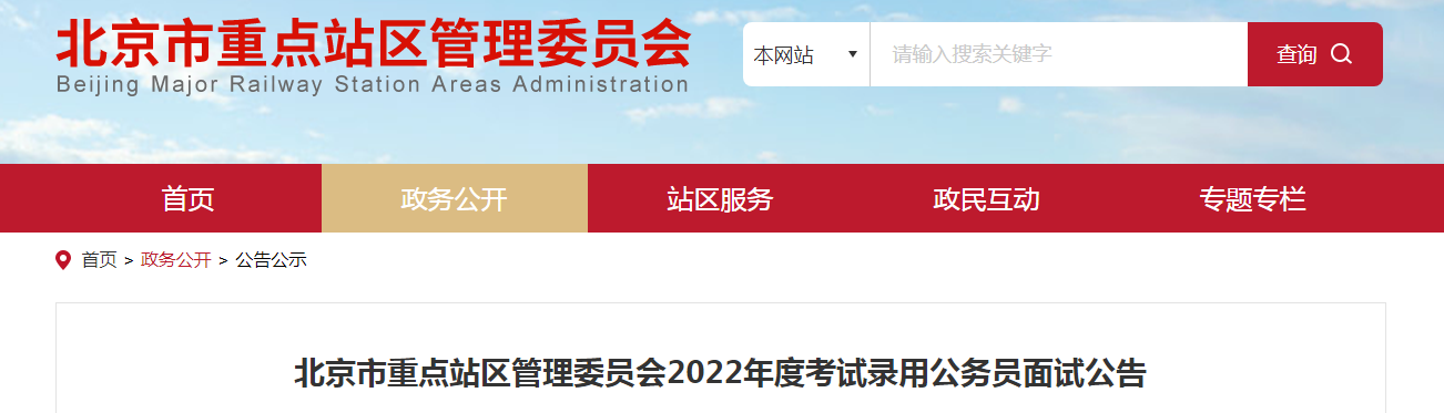 根據公務員法和公務員錄用有關規(guī)定,現就北京市重點站區(qū)管理委員會2022年度考試錄用公務員面試有關事宜通知如下: