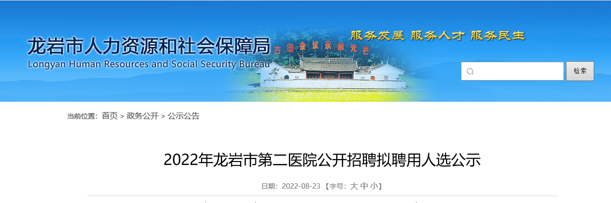 2022福建龍巖市第二醫(yī)院招聘擬聘用人選公示已出,公示時間:2022年8月23日至2022年8月29日,現(xiàn)將招聘公示原文發(fā)布如下: