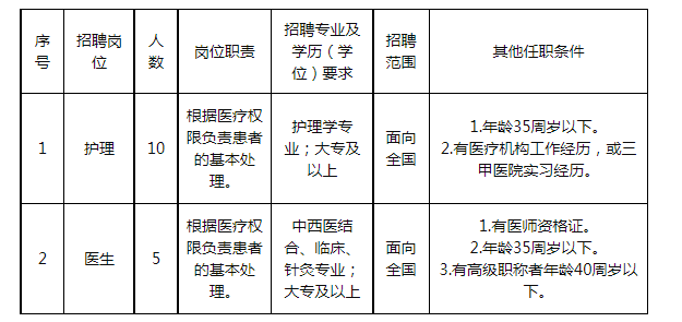 備注:學(xué)歷、職稱、執(zhí)(職)業(yè)資格、上崗證的取得時(shí)間和年齡、工作年限的計(jì)算截止時(shí)間為公告發(fā)布之日起。醫(yī)生崗位納入事業(yè)員額。