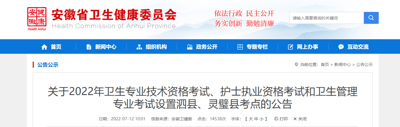 為認(rèn)真貫徹落實(shí)新冠肺炎疫情防控部署要求,切實(shí)保障廣大考生及考務(wù)工作人員的身體健康和生命安全,經(jīng)研究決定,2022年衛(wèi)生專業(yè)技術(shù)資格考試、護(hù)士執(zhí)業(yè)資格考試和衛(wèi)生管理專業(yè)考試將在宿州市泗縣、靈璧縣設(shè)置考點(diǎn)。