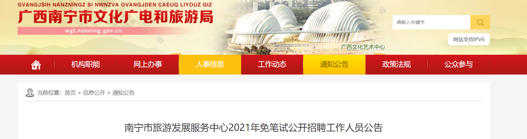 招聘公告發(fā)布地址:南寧市人力資源和社會(huì)保障局網(wǎng)站(http://rsj.nanning.gov.cn/)、主管部門南寧市文化廣電和旅游局網(wǎng)站(http://wgl.nanning.gov.cn/)。