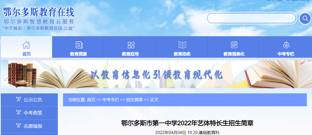 從鄂爾多斯教育在線了解到,內(nèi)蒙古鄂爾多斯市第一中學2022年藝體特長生招生簡章已發(fā)布,詳細內(nèi)容如下: