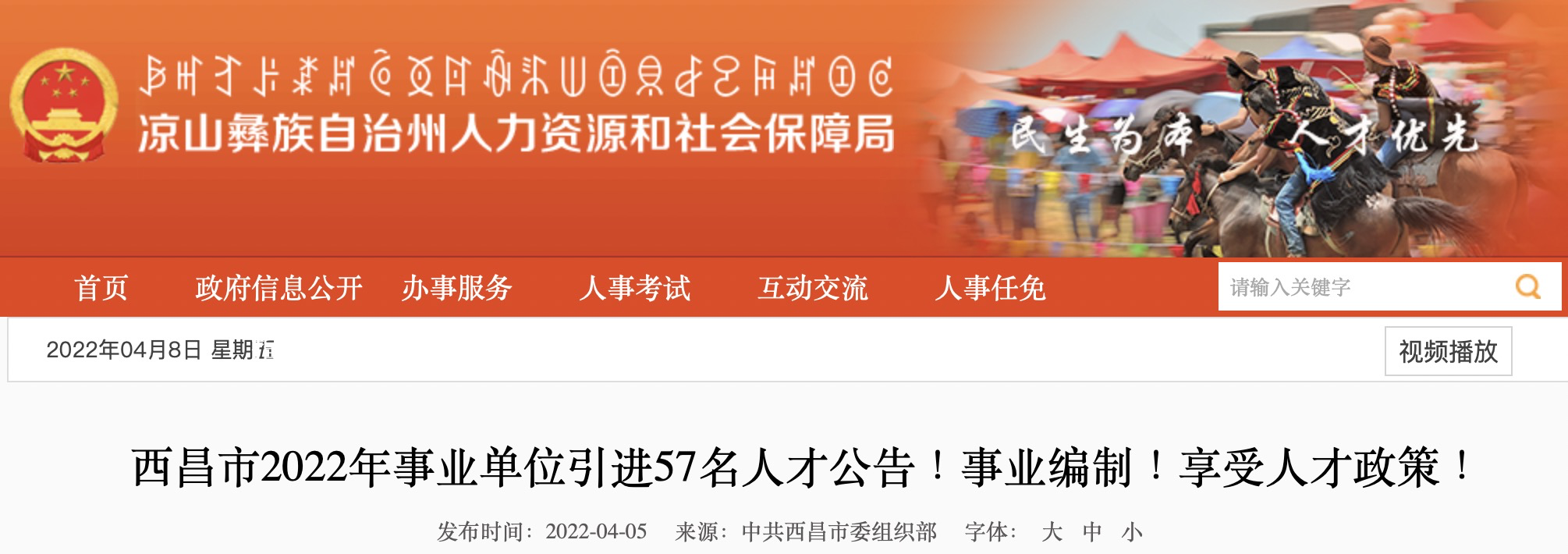 2022年四川涼山州西昌市事業(yè)單位事業(yè)編制人才引進公告【57人】已發(fā)布,報名截止時間為:2022年4月12日,現(xiàn)將招聘公告原文發(fā)布如下: