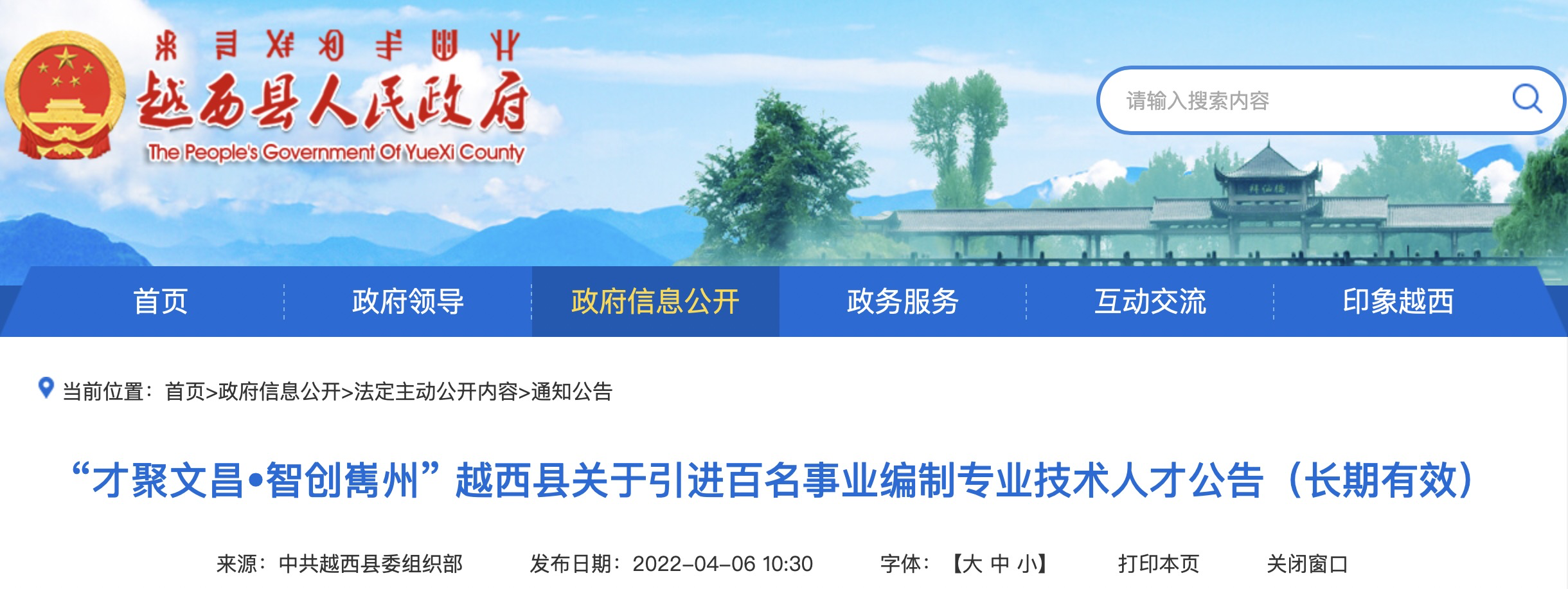 2022年四川涼山州越西縣百名事業(yè)編制專業(yè)技術(shù)人才引進(jìn)公告已發(fā)布,報(bào)名時(shí)間為:長(zhǎng)期有效,現(xiàn)將招聘公告原文發(fā)布如下: