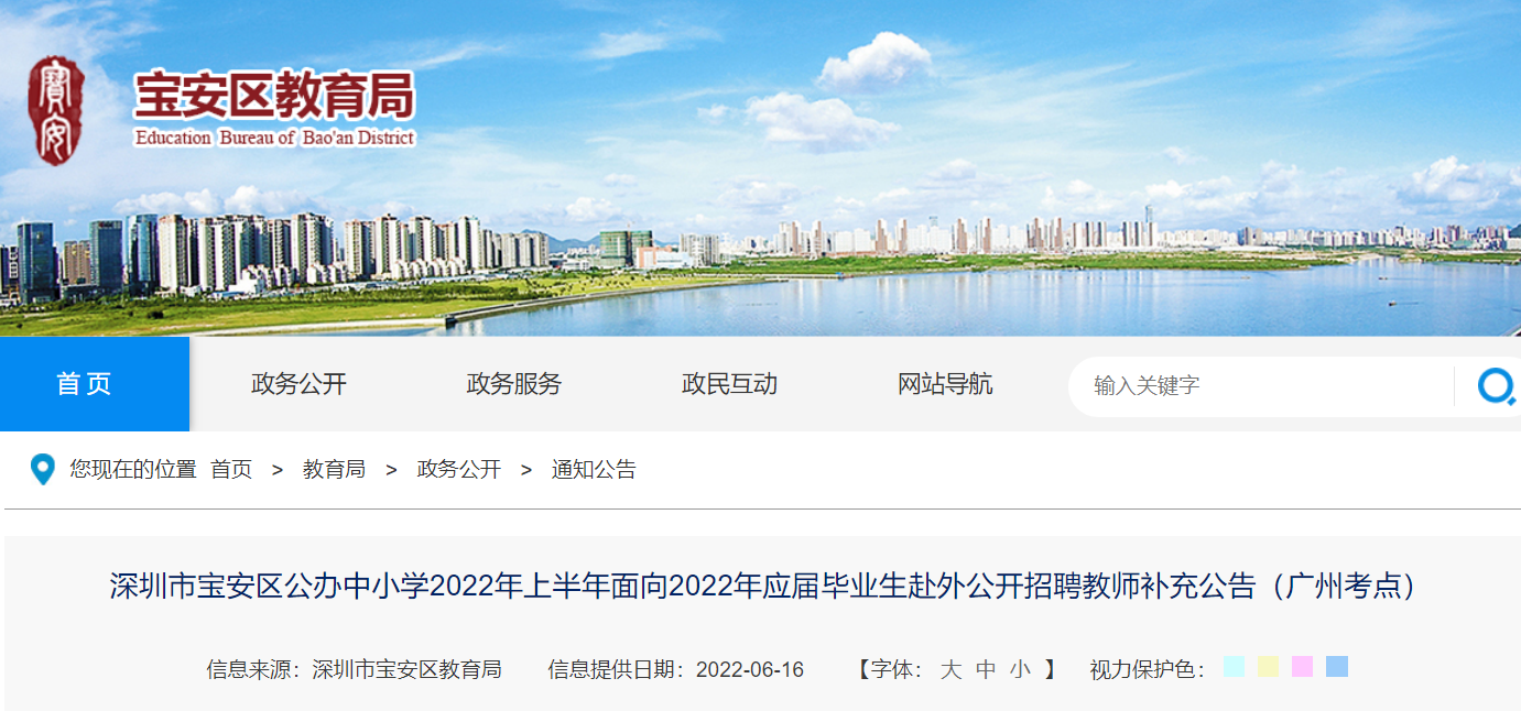 2022上半年廣東深圳寶安區(qū)公辦中小學赴外招聘教師補充公告(廣州考點)已發(fā)布,報名時間:6月16日至6月21日。現(xiàn)將招聘公告原文發(fā)布如下: