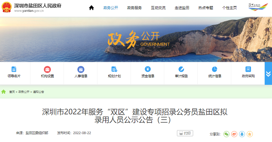 根據(jù)《深圳市2022年服務(wù)“雙區(qū)”建設(shè)專項招錄公務(wù)員公告》,現(xiàn)對鹽田區(qū)擬錄用人員予以公示(第三批,具體名單見附件)。