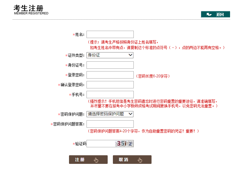 登錄后,考生需要進行注冊。要求正確填寫姓名、選擇證件類型、填寫證件號碼。以前參加過筆試的考生,需要重新進行注冊,填報個人信息和上傳個人照片,重新注冊不影響考生已獲得的筆試和面試成績。