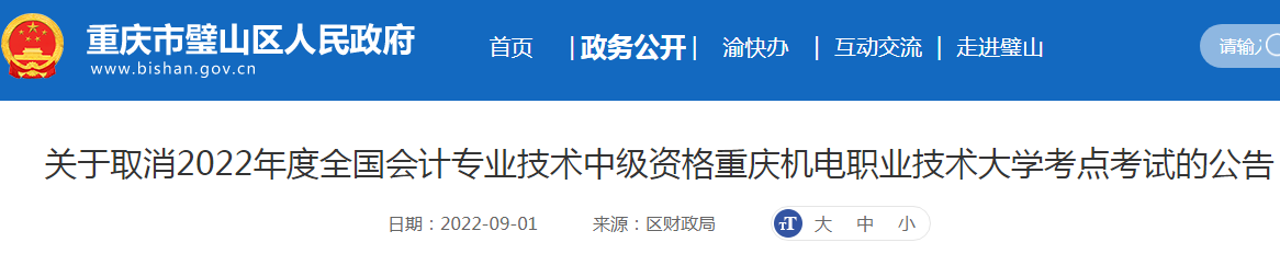 小編根據(jù)重慶市璧山區(qū)財政局發(fā)布“關于取消2022年度全國會計專業(yè)技術中級資格重慶機電職業(yè)技術大學考點考試的公告”得知,原定于2022年9月3日—5日舉行的全國會計專業(yè)技術中級資格重慶機電職業(yè)技術大學考點考試取消。