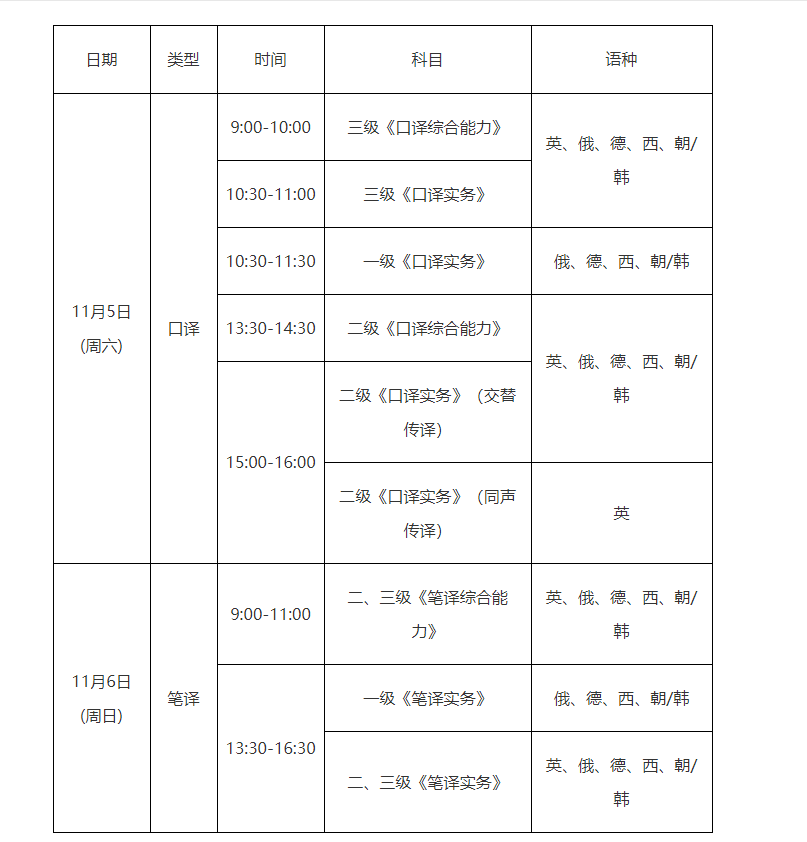 一級口譯考試設(shè)《口譯實(shí)務(wù)》1個(gè)科目,二、三級口譯考試設(shè)《口譯綜合能力》和《口譯實(shí)務(wù)》2個(gè)科目。一級筆譯考試設(shè)《筆譯實(shí)務(wù)》1個(gè)科目,二、三級筆譯考試設(shè)《筆譯綜合能力》和《筆譯實(shí)務(wù)》2個(gè)科目。具體時(shí)間安排如下: