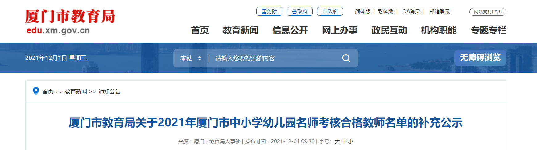 從廈門市教育局獲悉,2021年福建廈門中小學(xué)幼兒園名 師考核合格教師名單的補充公示,請相關(guān)人員仔細閱讀,具體詳情如下: