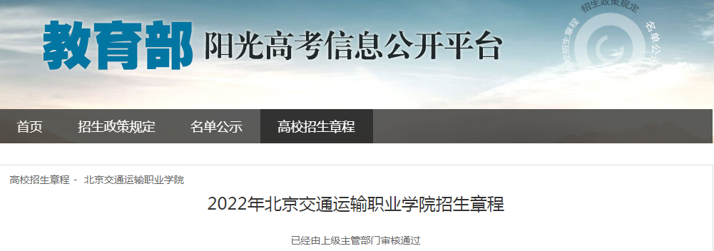 從教育部陽光高考信息公開平臺獲悉,北京交通運輸職業(yè)學院2022年招生章程已公布,具體詳情如下: