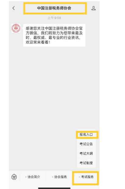 1.報(bào)名考生首先要關(guān)注中國(guó)注冊(cè)稅務(wù)師協(xié)會(huì)官方微信號(hào),在右下角找到"考試服務(wù)",點(diǎn)擊選擇“報(bào)名入口”,如圖: