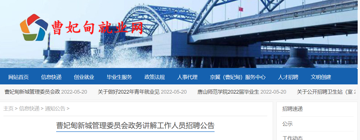 2022河北省唐山市曹妃甸新城市管理委員會政務(wù)講解人員招聘公告已發(fā)布。為滿足實際工作需要,現(xiàn)面向社會公開招聘政務(wù)講解工作人員2名。為您整理了招聘條件和報名流程,供您參考。