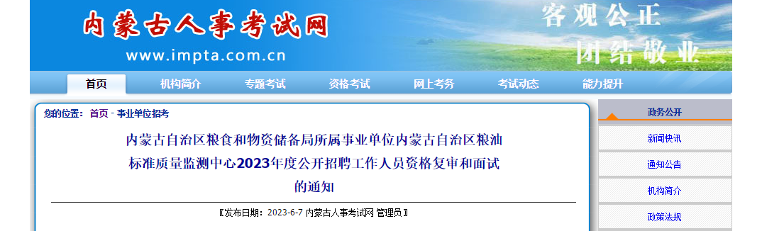 2023內(nèi)蒙古糧食和物資儲備局所屬事業(yè)單位內(nèi)蒙古糧油標(biāo)準(zhǔn)質(zhì)量監(jiān)測中心資格復(fù)審面試通知。 資格復(fù)審:2023年6月8日請考生于14:30-17:00在指定地點(diǎn)進(jìn)行資格復(fù)審。現(xiàn)將公告原文發(fā)布如下: