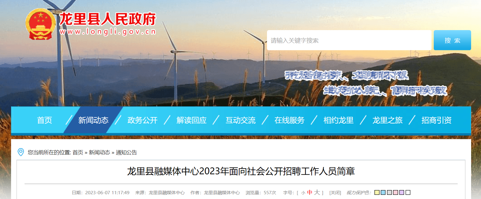 在龍里縣人民政府網(wǎng)(http://www.longli.gov.cn/)、“龍城視界”APP、“龍里人力資源市場”微信公眾號發(fā)布公開招聘簡章。公告時間從2023年6月7日至2023年6月21日。