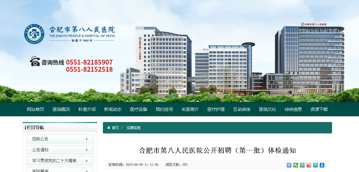 2023安徽合肥市第八人民醫(yī)院招聘(第一批)體檢時間已公布,請體檢人員于2023年6月12日(周一)上午7:00前,前往合肥市第八人民醫(yī)院會議中心集合,現(xiàn)將招聘通知原文發(fā)布如下:
