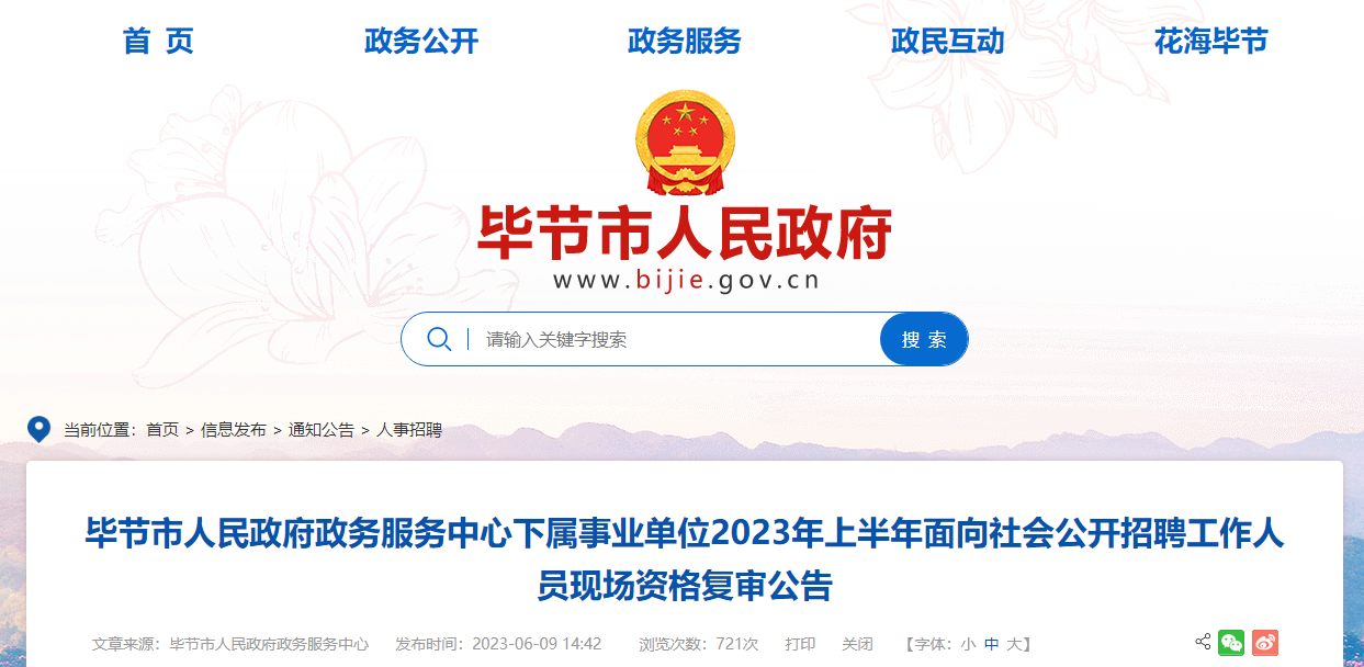 2023年貴州省畢節(jié)市人民政府政務(wù)服務(wù)中心下屬事業(yè)單位面向社會(huì)招聘現(xiàn)場(chǎng)資格復(fù)審公告。資格復(fù)審時(shí)間2023年6月14日至6月15日(8:30—17:30)。現(xiàn)將公告原文發(fā)布如下: