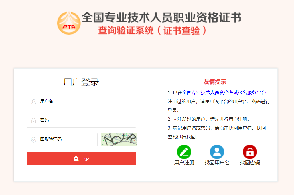 已在中國人事考試網(wǎng)“全國專業(yè)技術(shù)人員資格考試報(bào)名服務(wù)平臺”注冊過的持證人員,請直接使用該平臺的用戶名、密碼進(jìn)行登錄。