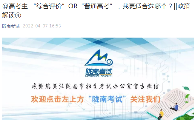 從隴南考試了解到,2022年甘肅高考生 “綜合評(píng)價(jià)”O(jiān)R“普通高考”小建議已發(fā)布,詳細(xì)內(nèi)容如下: