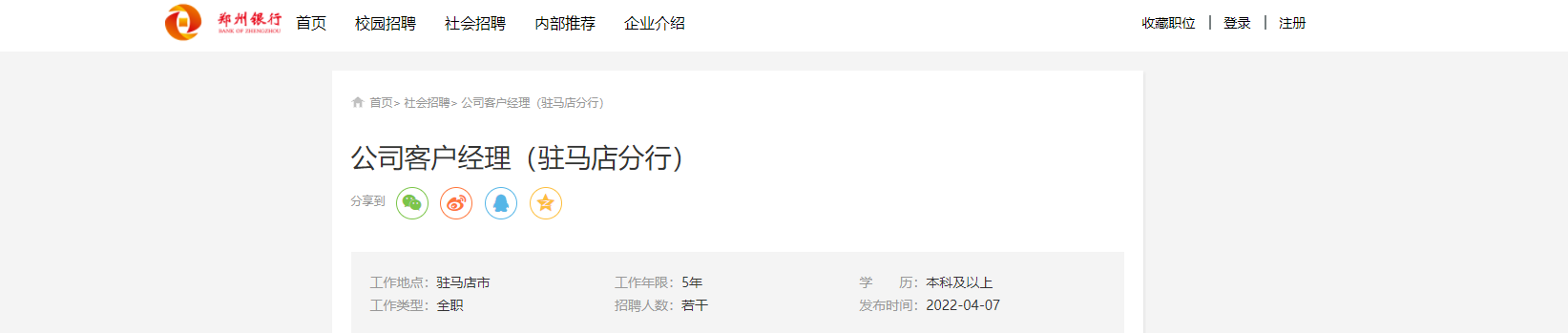 2022鄭州銀行河南駐馬店分行社會招聘若干人,報名投遞入口已開通,現將招聘詳情發(fā)布如下: