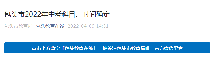 近日,包頭市教育局印發(fā)《包頭市2022年初中學(xué)業(yè)水平考試暨八年級生物、地理結(jié)業(yè)考試與高中階段學(xué)校招生工作方案》,2022年中考科目時(shí)間確定。
