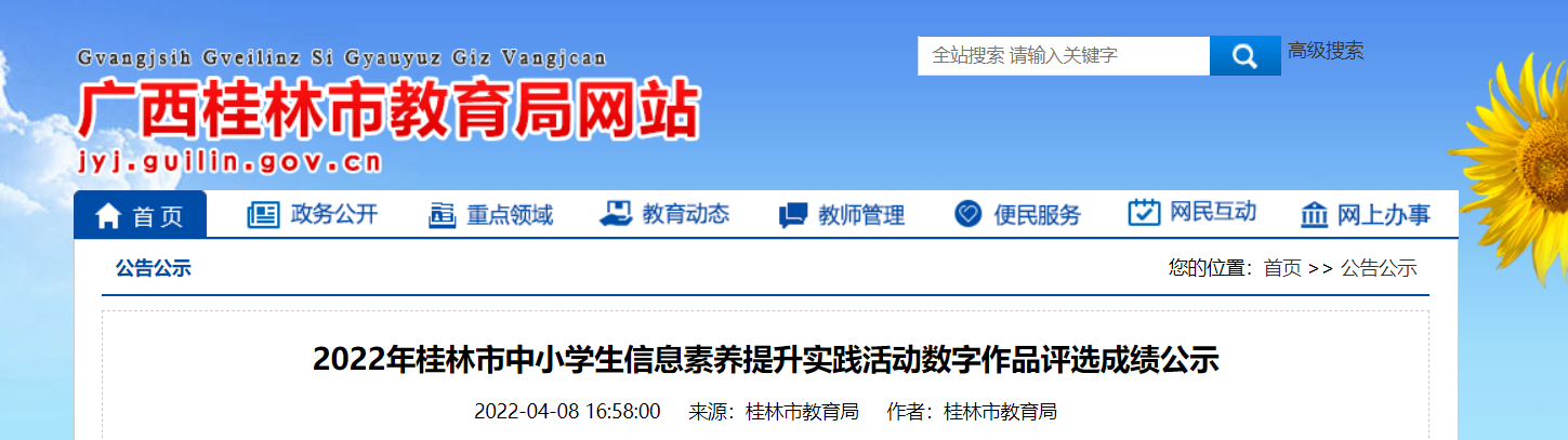 “2022年桂林市中小學生信息素養(yǎng)提升實踐活動數(shù)字作品評選活動”已圓滿結束,現(xiàn)將在活動中獲得獎項的名單予以公示(名單見附件)。