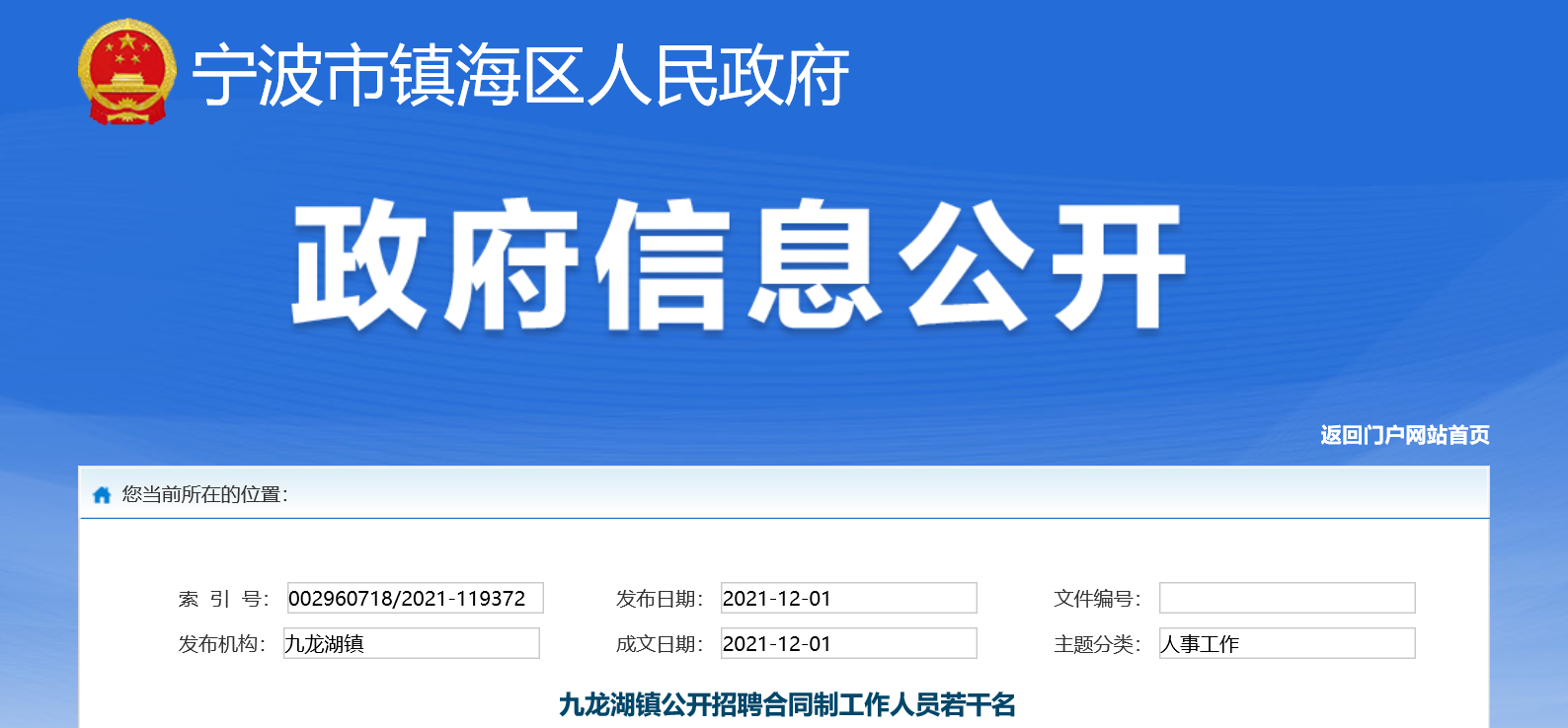 2021浙江省寧波市鎮(zhèn)海區(qū)九龍湖鎮(zhèn)招聘公告已發(fā)布。報(bào)名時(shí)間:2021年11月29日—12月6日16時(shí)。為您整理了招聘條件和報(bào)名流程,供您參考。