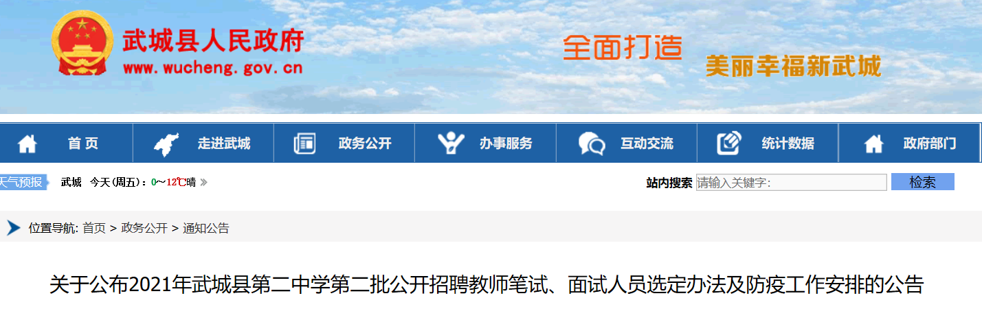 根據(jù)《2021年武城縣第二中學(xué)公開招聘教師簡章》,現(xiàn)將2021年武城縣第二中學(xué)第二批公開招聘教師筆試、面試人員選定辦法及防疫工作安排的公告如下。一、筆試