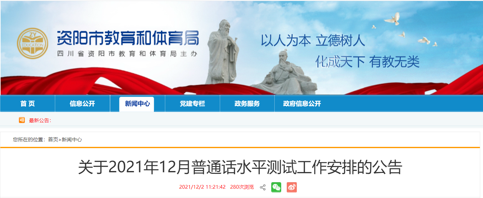 為進一步滿足社會考生普通話水平測試的需求,根據(jù)資陽市普通話水平測試工作安排,將于2021年12月開展普通話水平測試,現(xiàn)就相關事宜公告如下。
