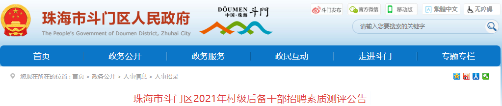 根據(jù)珠海市斗門區(qū)2021年村級(jí)后備干部招聘考務(wù)工作安排,同時(shí)結(jié)合我區(qū)疫情防控工作要求,現(xiàn)將素質(zhì)測(cè)評(píng)有關(guān)工作安排公告如下: