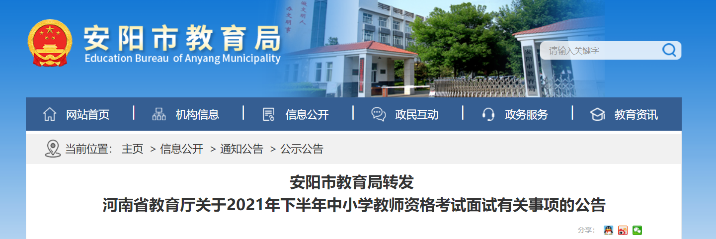 從安陽市教育局獲悉,2021下半年河南安陽中小學(xué)教師資格考試面試有關(guān)事項(xiàng)公告已公布,請相關(guān)人員仔細(xì)閱讀,具體詳情如下: