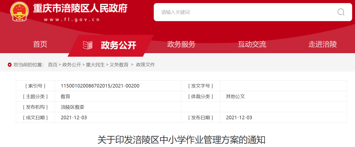 關于重慶市涪陵區(qū)中小學作業(yè)管理方案的通知已發(fā)布。為深入貫徹落實中共中央辦公廳、國務院辦公廳《關于進一步減輕義務教育階段學生作業(yè)負擔和校外培訓負擔的意見》(中辦發(fā)〔2021〕40號)、教育部辦公廳《關于加強義務教育學校作業(yè)管理的通知》(教基廳函〔2021〕13號)精神,進一步規(guī)范中小學辦學行為,切實減輕學生課業(yè)負擔,促進學生全面發(fā)展,特制訂本方案。為您整理了以下內(nèi)容,供您參考。