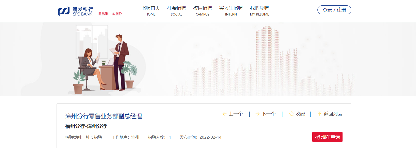 2022浦發(fā)銀行福建漳州分行零售業(yè)務(wù)部副總經(jīng)理社會招聘1人,報名申請入口已開通,現(xiàn)將招聘詳情發(fā)布如下: