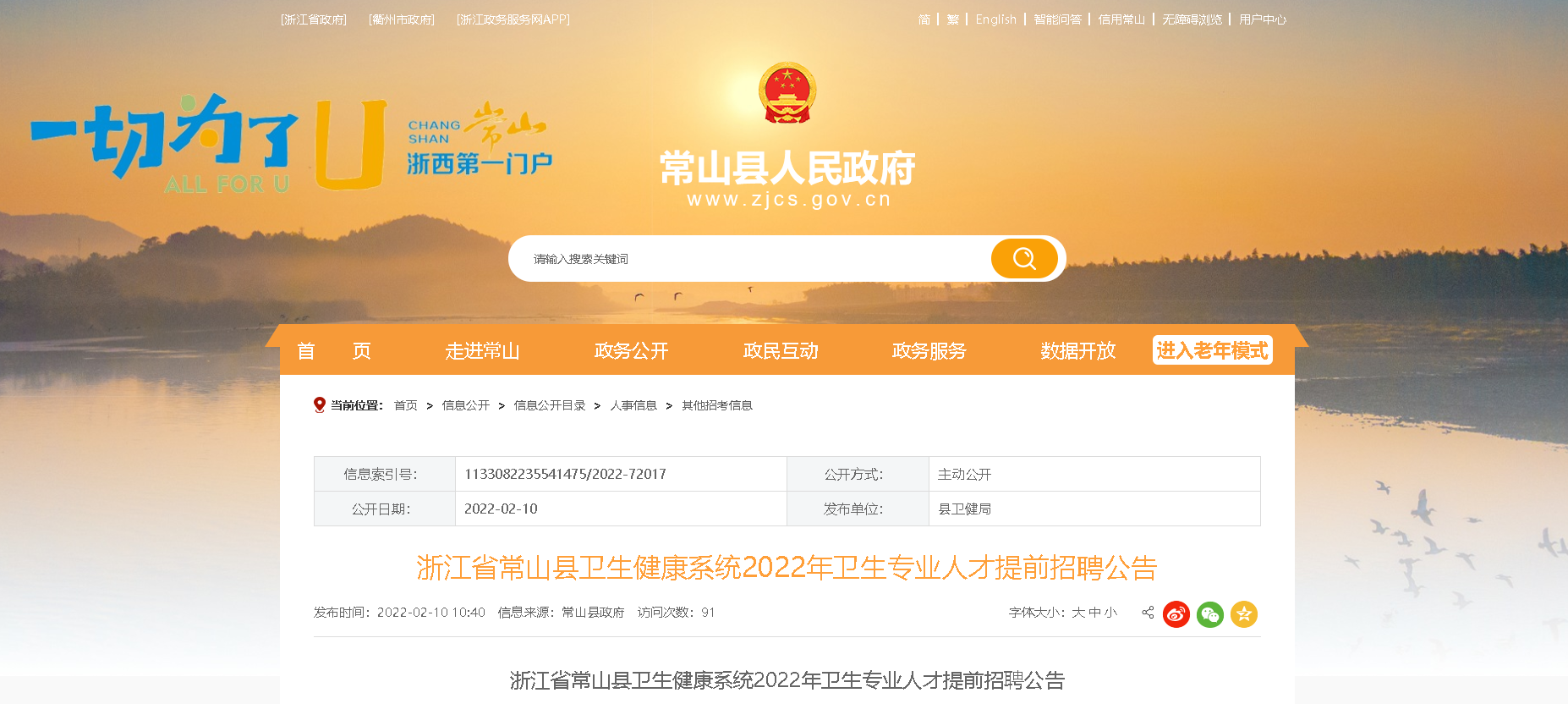 1.發(fā)布招考信息:浙江省常山縣政府門(mén)戶網(wǎng)(網(wǎng)址:www.changshan.gov.cn)、健康常山在線微信公眾號(hào)、相關(guān)醫(yī)學(xué)類(lèi)高校等網(wǎng)站及有關(guān)新聞媒體向社會(huì)發(fā)布提前招聘信息。