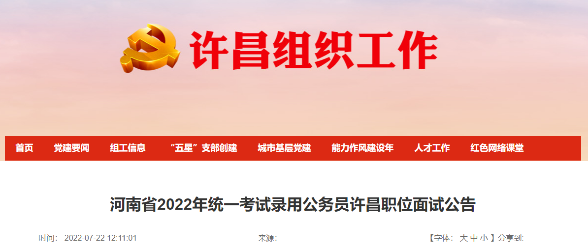 根據(jù)《河南省2022年統(tǒng)一考試錄用公務(wù)員工作實(shí)施方案》和筆試情況,現(xiàn)將許昌市招錄職位面試有關(guān)事項(xiàng)公告如下: