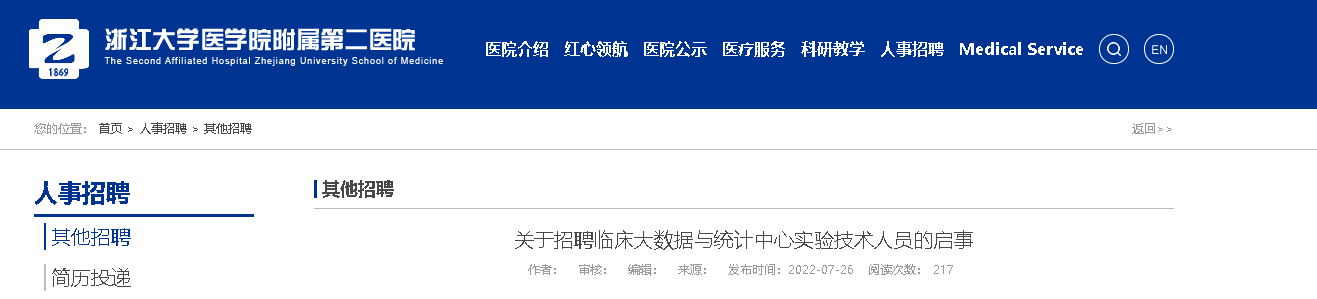 簡歷投遞:請在浙大二院招聘網(wǎng)http://zp.z2hospital.com/,注冊并按系統(tǒng)要求填寫應聘材料,意向科室選擇“臨床大數(shù)據(jù)與統(tǒng)計中心”,崗位選擇“實驗技術”進行投遞。