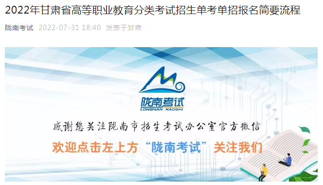 從隴南考試了解到,2022年甘肅省高等職業(yè)教育分類考試招生單考單招報(bào)名簡(jiǎn)要流程已發(fā)布,詳細(xì)內(nèi)容如下: