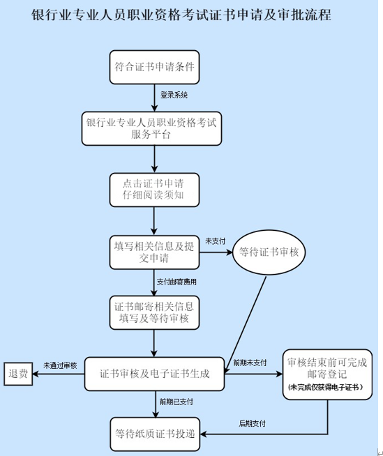 2014年起,銀行業(yè)專業(yè)人員職業(yè)資格考試已啟用紙質(zhì)證書及紙質(zhì)專業(yè)類別合格證明,證書發(fā)放采取郵寄方式。證書申請過程中,考生需在系統(tǒng)同時填寫證書郵寄等相關(guān)信息,待證書審核工作結(jié)束后,等候證書發(fā)放(郵寄費由考生自行承擔(dān))。