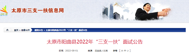 根據(jù)工作安排,陽曲縣2022年“三支一扶”人員招募面試工作定于8月6日進行,現(xiàn)就面試有關事項公告如下: