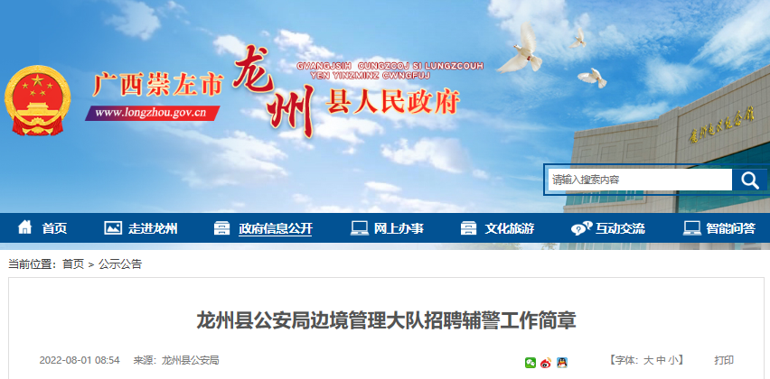 2022年廣西崇左市龍州縣公安局邊境管理大隊(duì)招聘輔警工作簡章已公布,為了方便廣大考生的查閱,下面為您詳細(xì)介紹一下本次招聘輔警工作的具體事宜,希望廣大考生及時(shí)關(guān)注,如有相關(guān)疑問,請關(guān)注招警考試頻道為您實(shí)時(shí)做出的更新。
