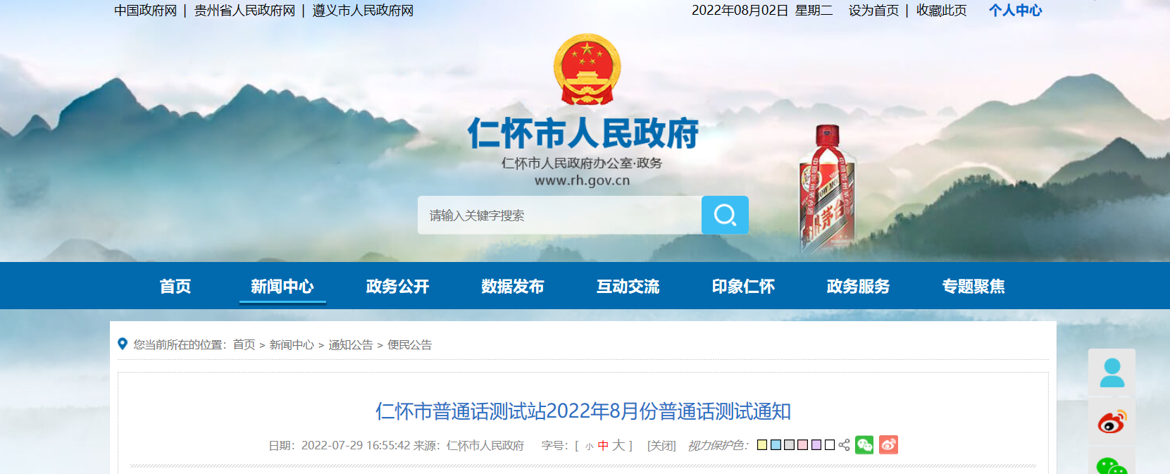 從仁懷市人民政府發(fā)布的《 2022年8月貴州遵義仁懷市普通話測(cè)試通知》得知,2022年8月貴州遵義仁懷市普通話考試時(shí)間及費(fèi)用已公布,考試時(shí)間為8月20日-8月21日,具體詳情如下: