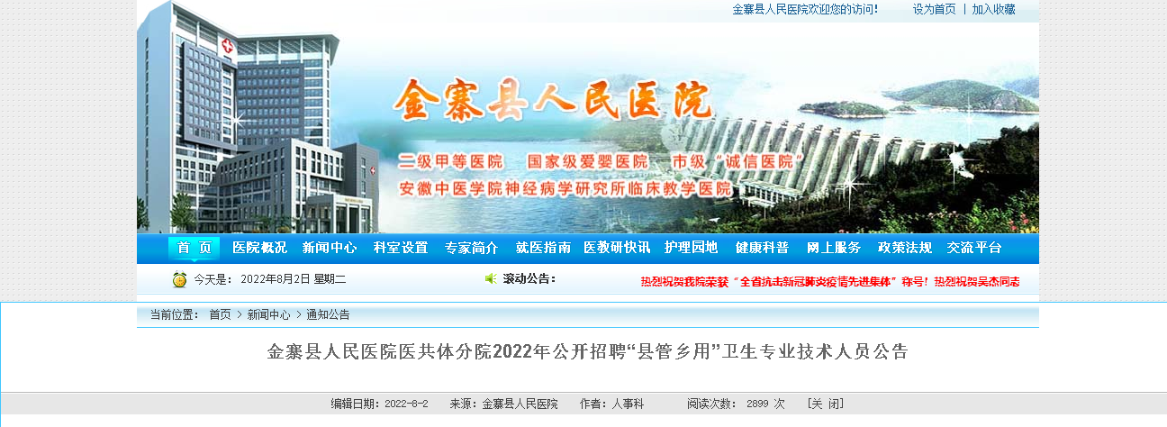金寨縣人民醫(yī)院醫(yī)共體分院2022年擬招聘“縣管鄉(xiāng)用”各類衛(wèi)生專業(yè)技術(shù)人員19名(詳見附件1)。