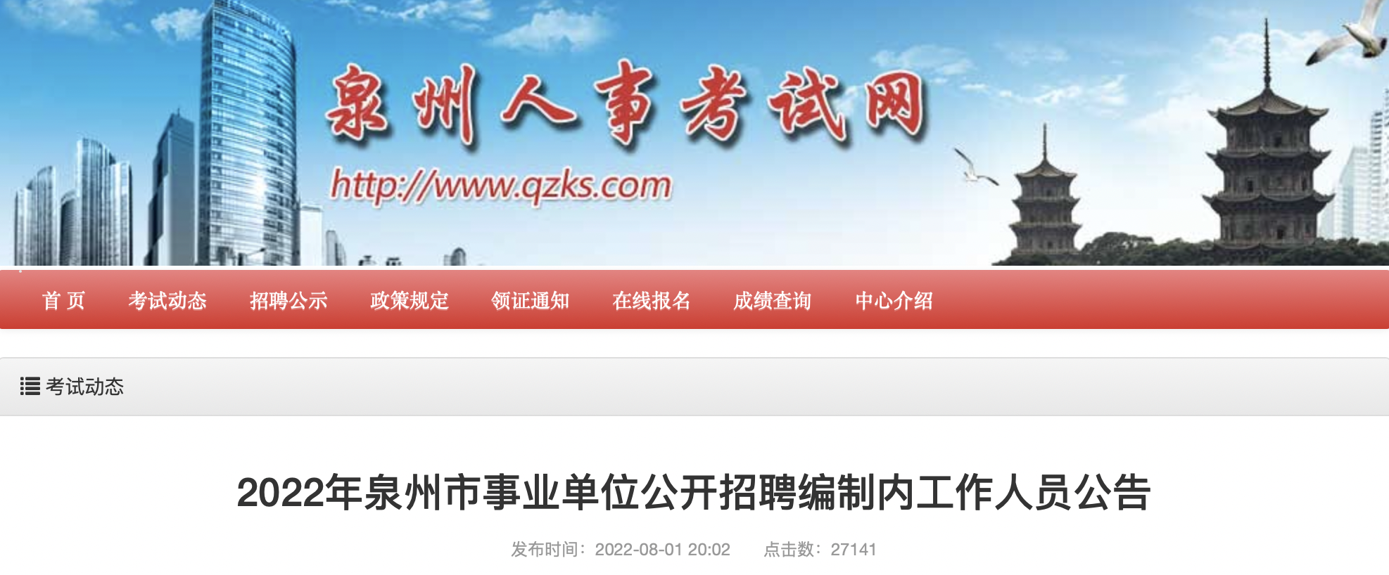 根據(jù)事業(yè)單位公開招聘工作人員有關規(guī)定,結合我市事業(yè)單位工作需要,中共泉州市委組織部、泉州市人力資源和社會保障局決定組織實施2022年泉州市部分事業(yè)單位公開招聘編制內(nèi)工作人員的工作。為做好常態(tài)化疫情防控前提下的事業(yè)單位工作人員公開招聘工作,現(xiàn)將有關事項公告如下:一、招聘單位、崗位、人數(shù)及資格要求