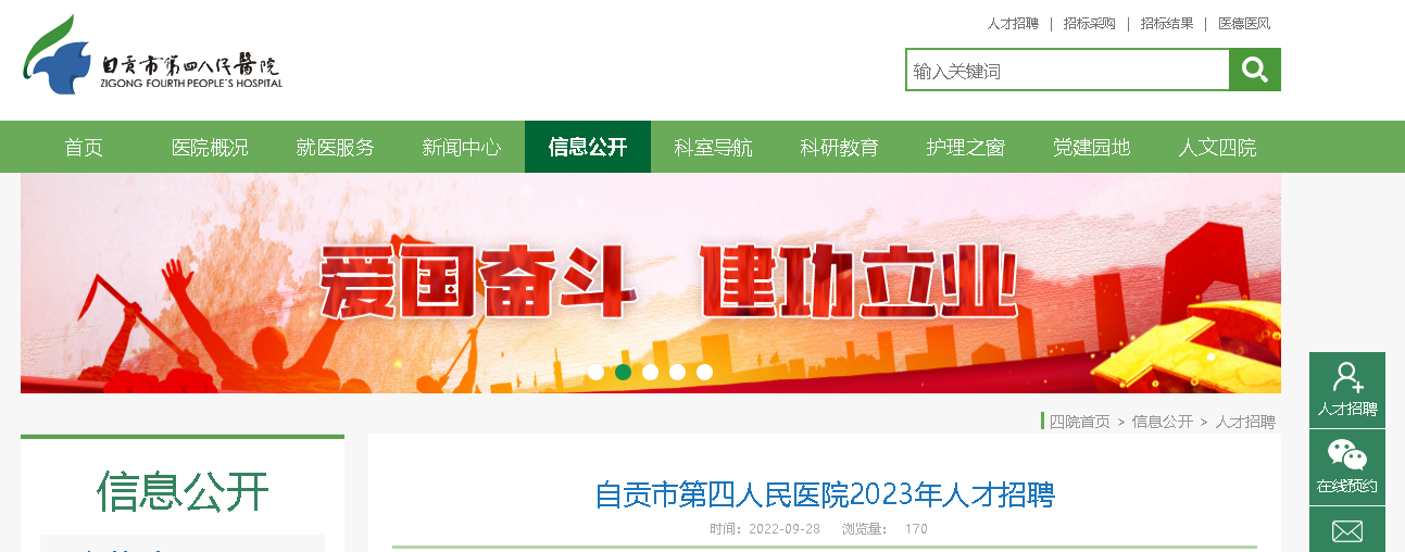2023四川自貢市第四人民醫(yī)院人才招聘162人,報名時間:招滿為止,現(xiàn)將招聘公告原文發(fā)布如下: